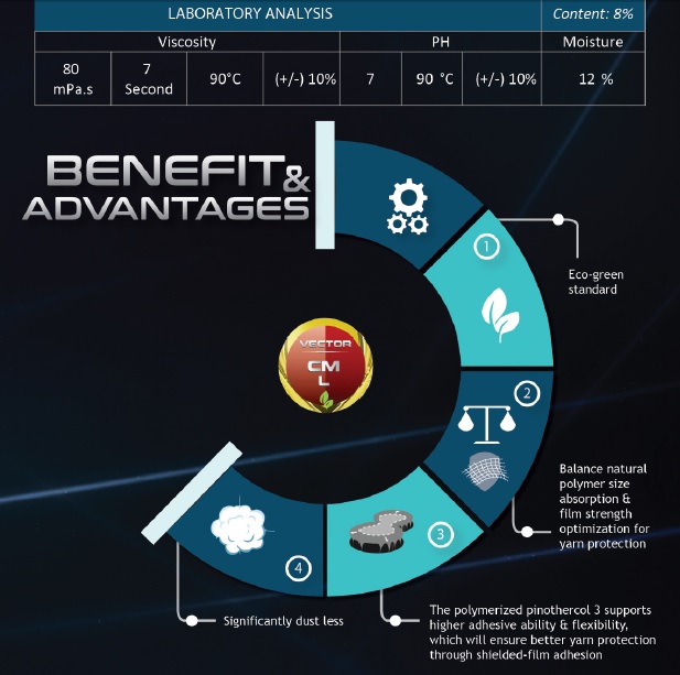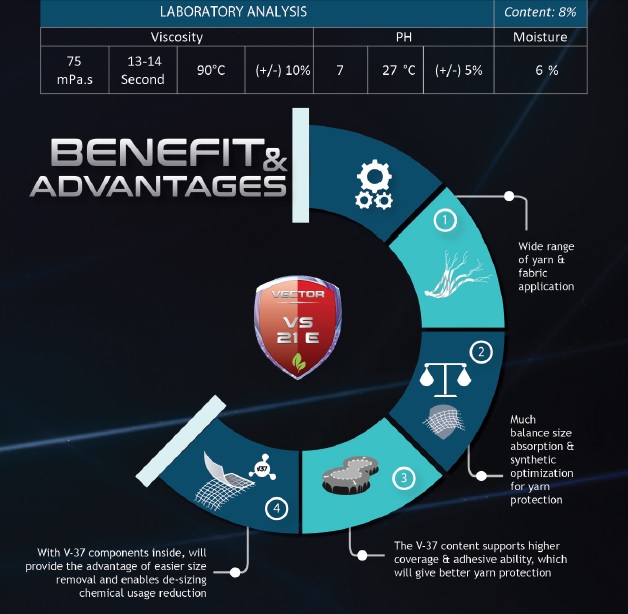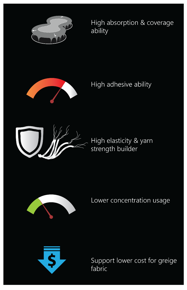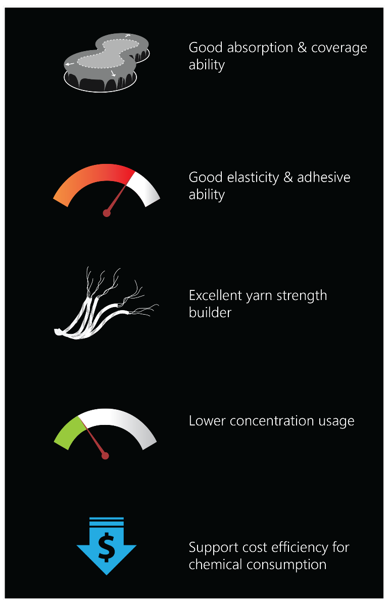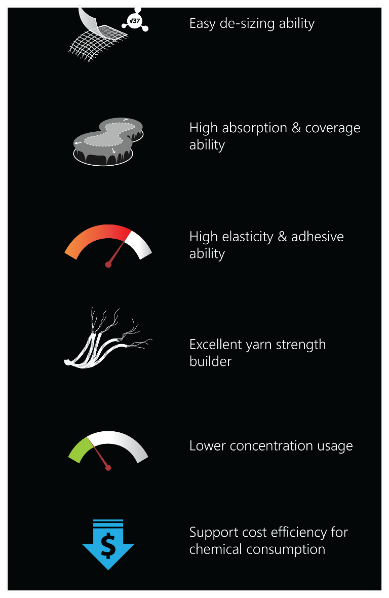 Higher weaving efficiency by excellent film strength, elasticity, and adhesiveness. Even more, Vector products also support higher coverage ability for optimum yarns’ protection.