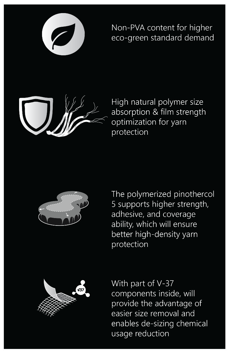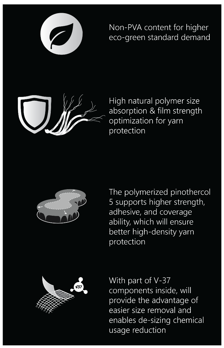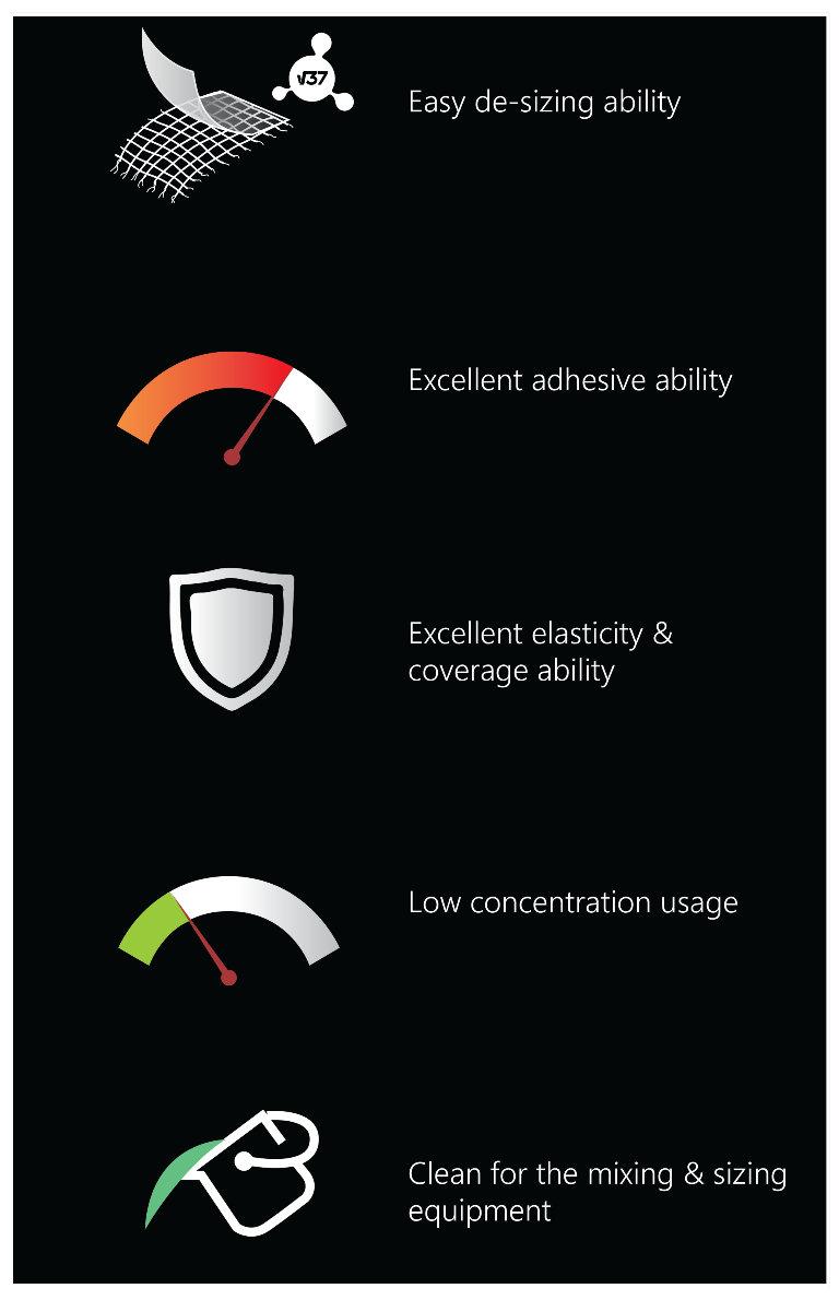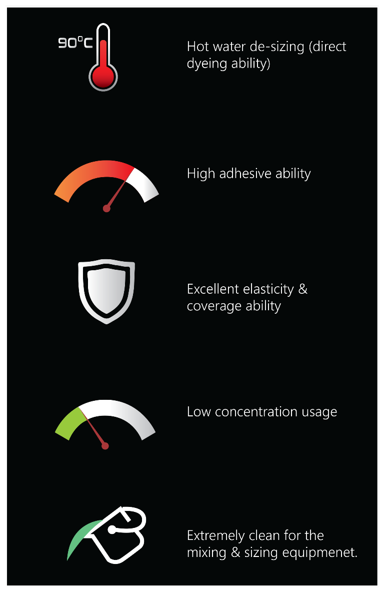 Higher weaving efficiency by excellent film strength, elasticity, and adhesiveness. Even more, Vector products also support higher coverage ability for optimum yarns’ protection.